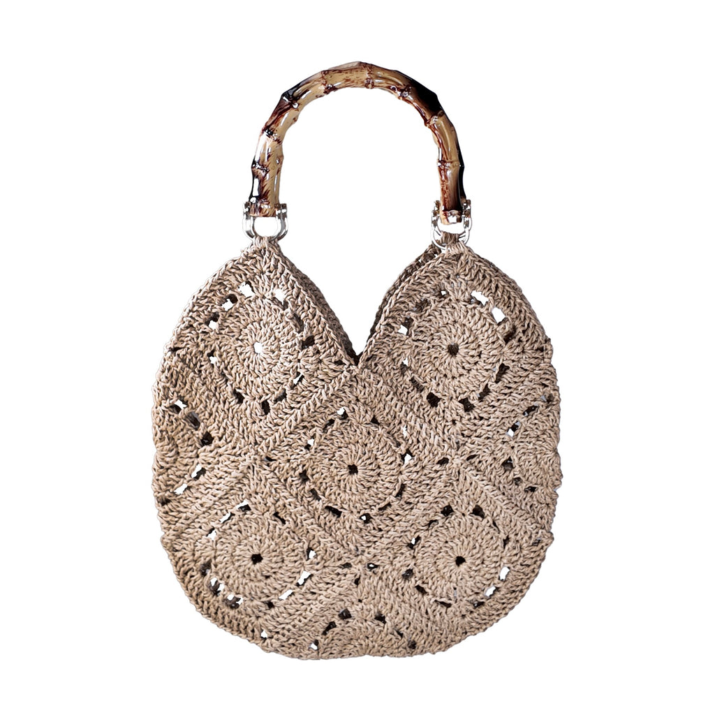 Die liebevoll, von Hand gefertigte Häkeltasche von BOZÀADA, vereint natürliche Eleganz mit handwerklichem Charme. Das detailreiche Häkelmuster im Granny-Square-Stil verleiht der Tasche einen authentischen Boho-Look, während der geschwungene Bambusgriff einen Hauch von Vintage-Flair hinzufügt.